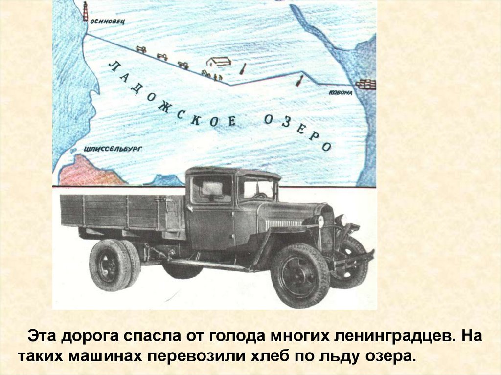 Эта дорога спасла от голода многих ленинградцев. Натаких машинах перевозили хлеб по льду озера.