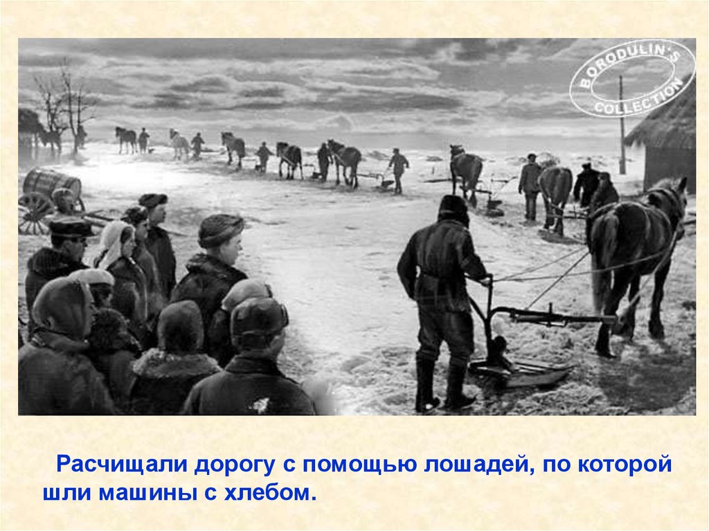 Расчищали дорогу с помощью лошадей, по которойшли машины с хлебом.