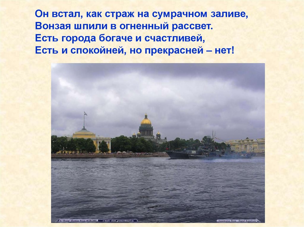 Он встал, как страж на сумрачном заливе,Вонзая шпили в огненный рассвет.