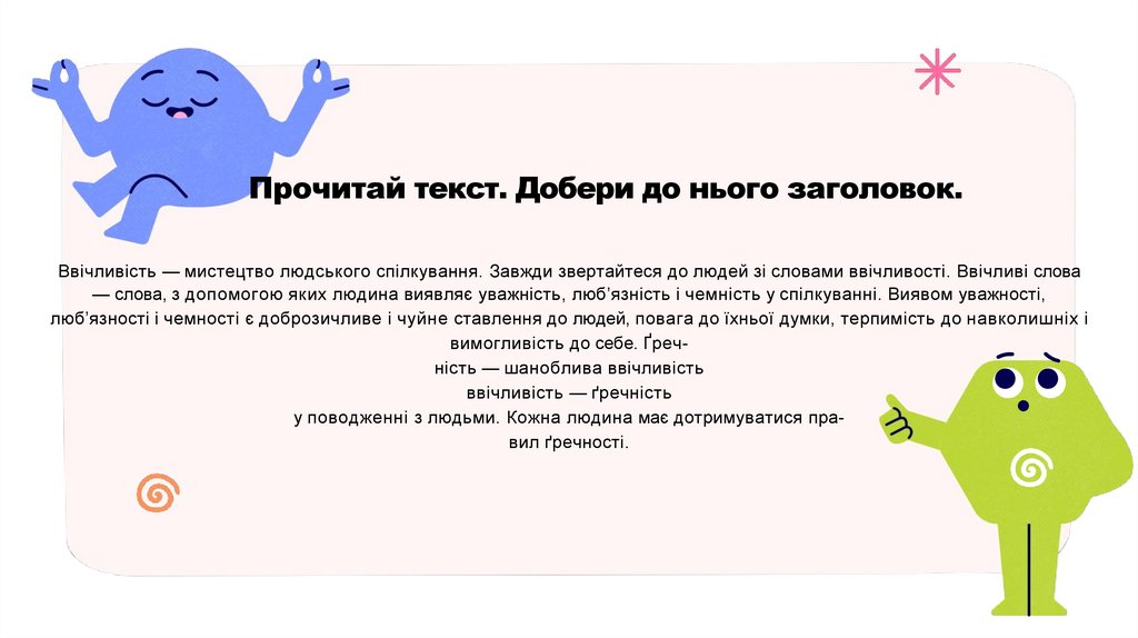 Прочитай текст. Добери до нього заголовок.Ввічливість — мистецтво людського спілкування. Завжди звертайтеся до людей зі словами ввічливості. Ввічливі слова