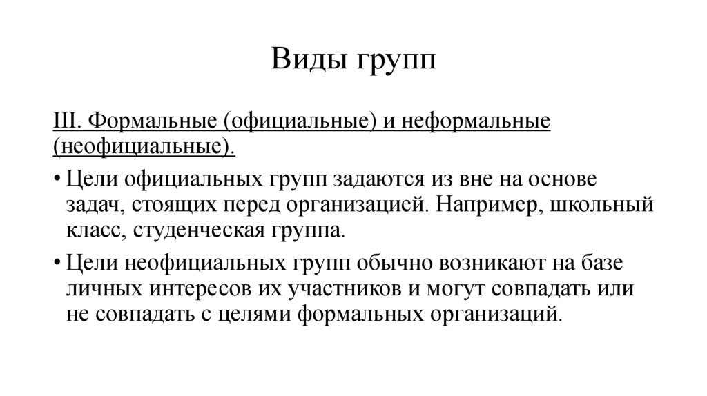 Виды группIII. Формальные (официальные) и неформальные