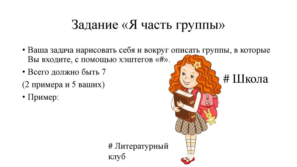 Задание «Я часть группы»• Ваша задача нарисовать себя и вокруг описать группы, в которые