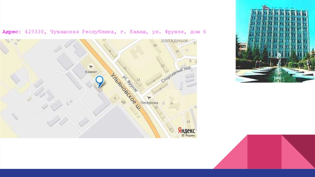Адрес: 429330, Чувашская Республика, г. Канаш, ул. Фрунзе, дом 69.