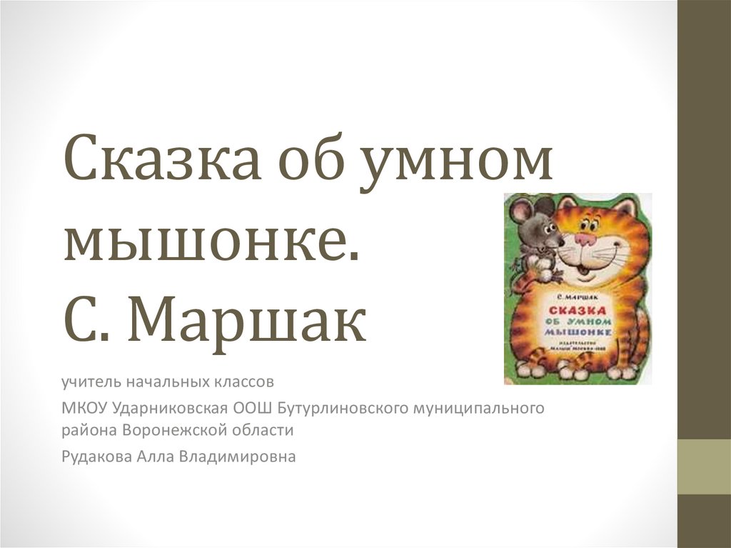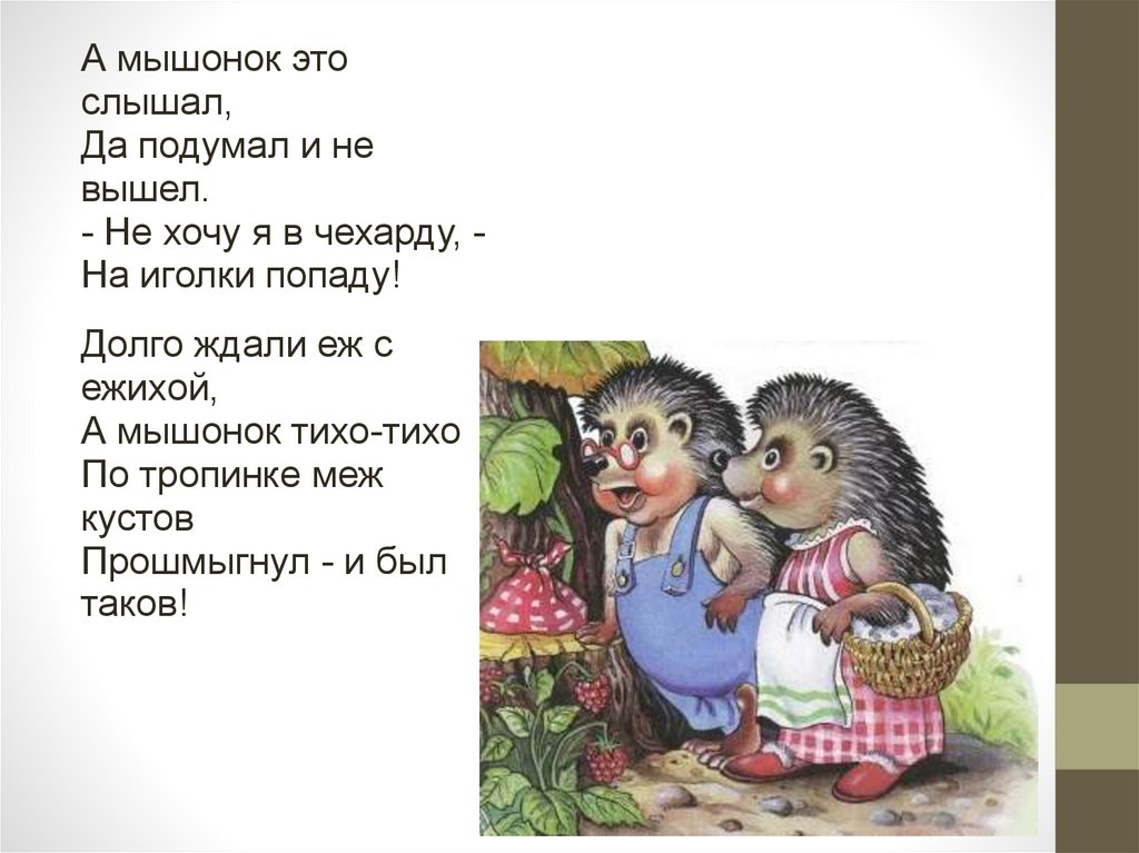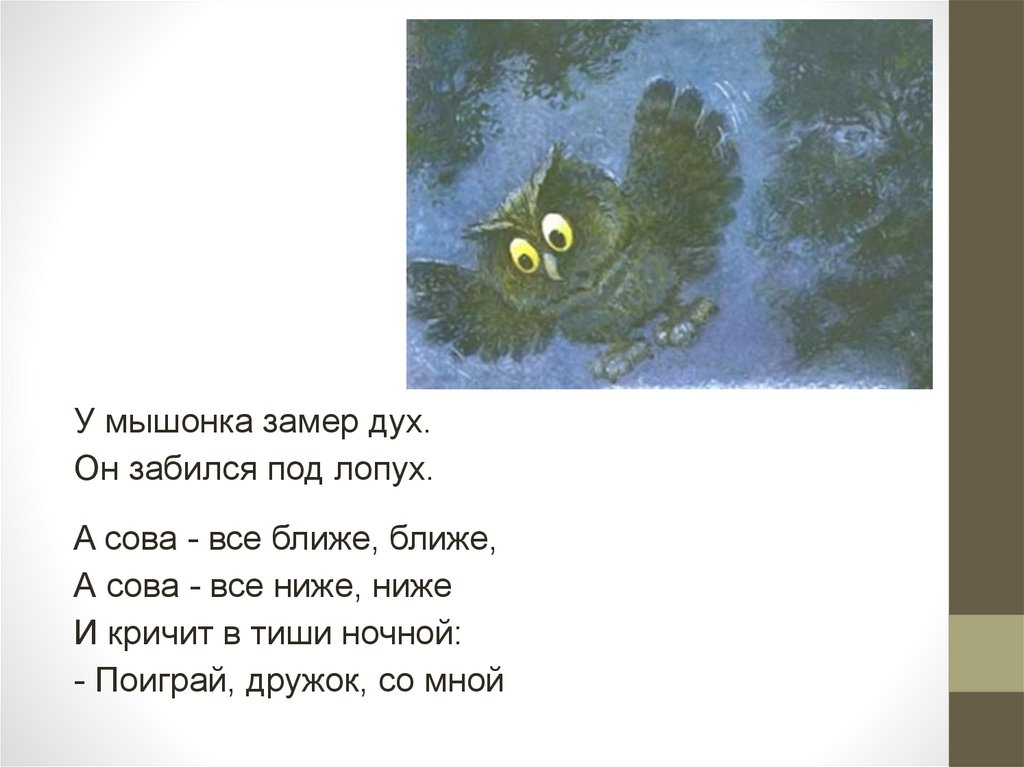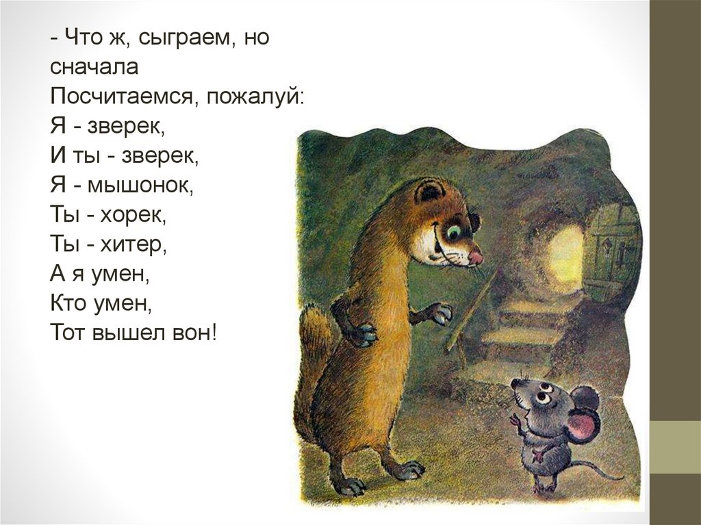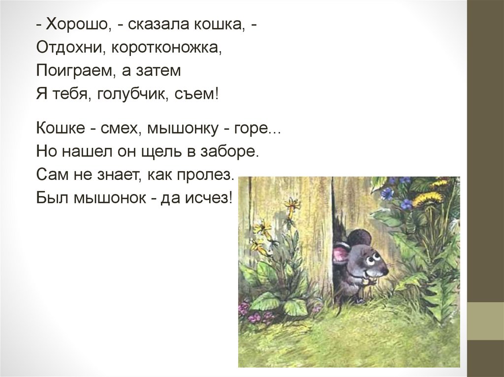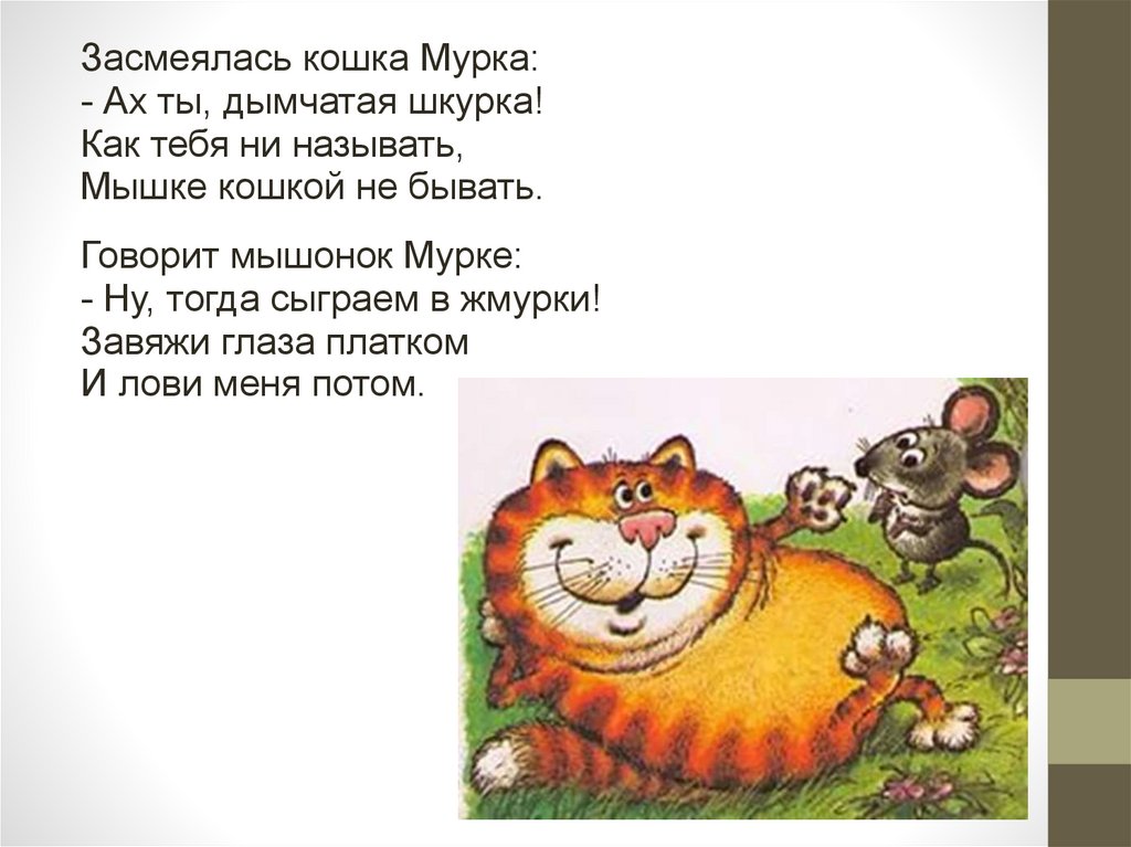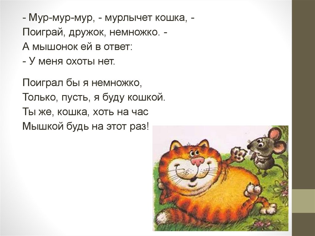 - Мур-мур-мур, - мурлычет кошка, Поиграй, дружок, немножко. А мышонок ей в ответ:- У меня охоты нет.