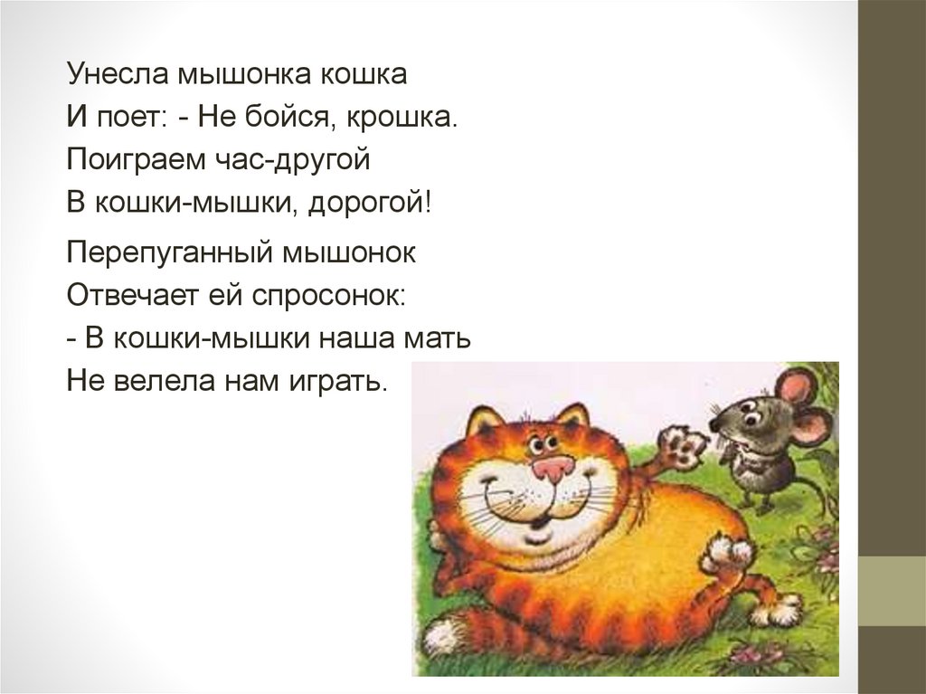Унесла мышонка кошкаИ поет: - Не бойся, крошка.