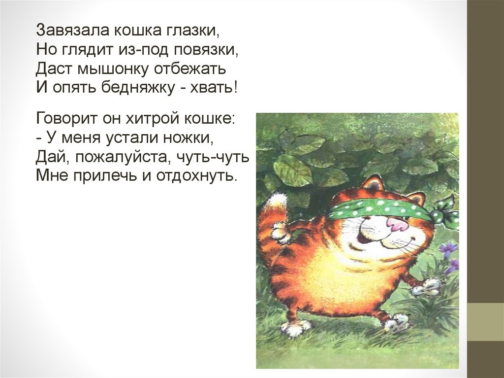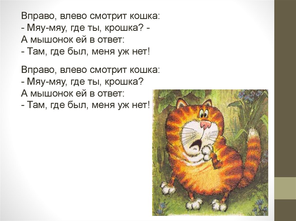 Вправо, влево смотрит кошка:- Мяу-мяу, где ты, крошка? А мышонок ей в ответ: