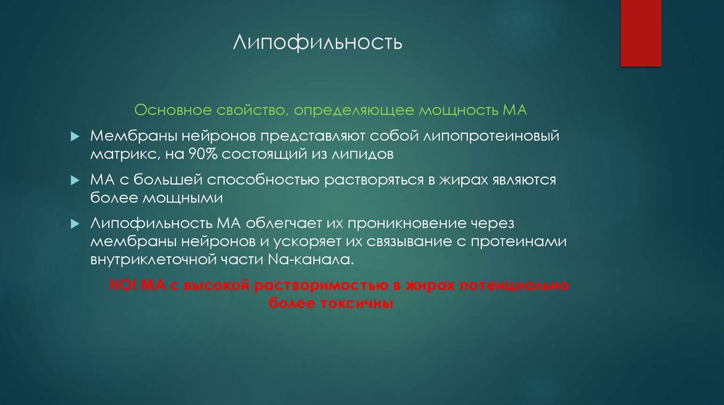 МА нужно быть липофильной, а чтобы связаться с белками Naканала нужно быть гидрофильной.
