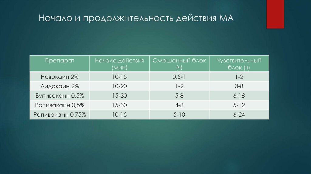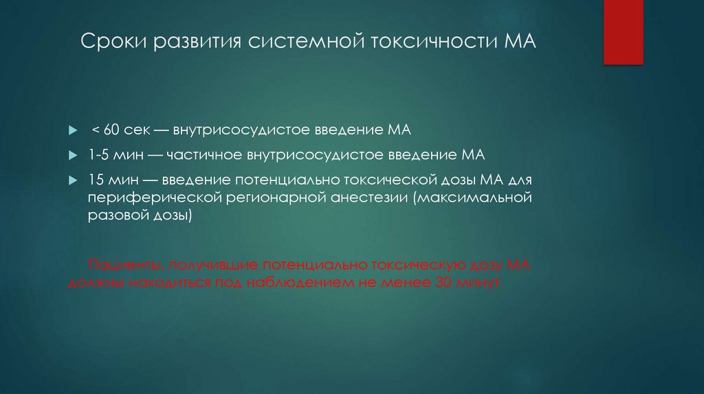 Сроки развития системной токсичности МА< 60 сек — внутрисосудистое введение МА