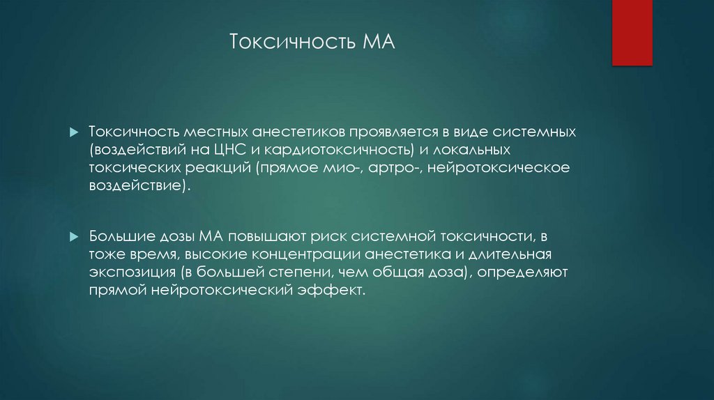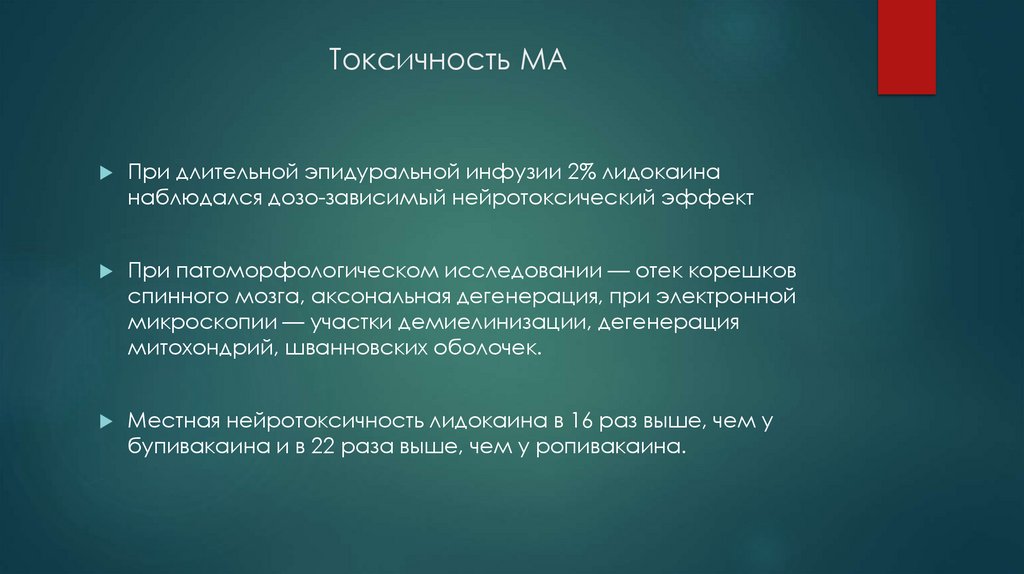 Токсичность МАПри длительной эпидуральной инфузии 2% лидокаина