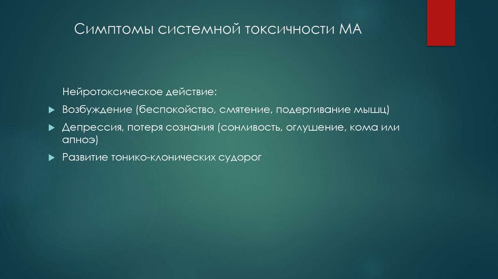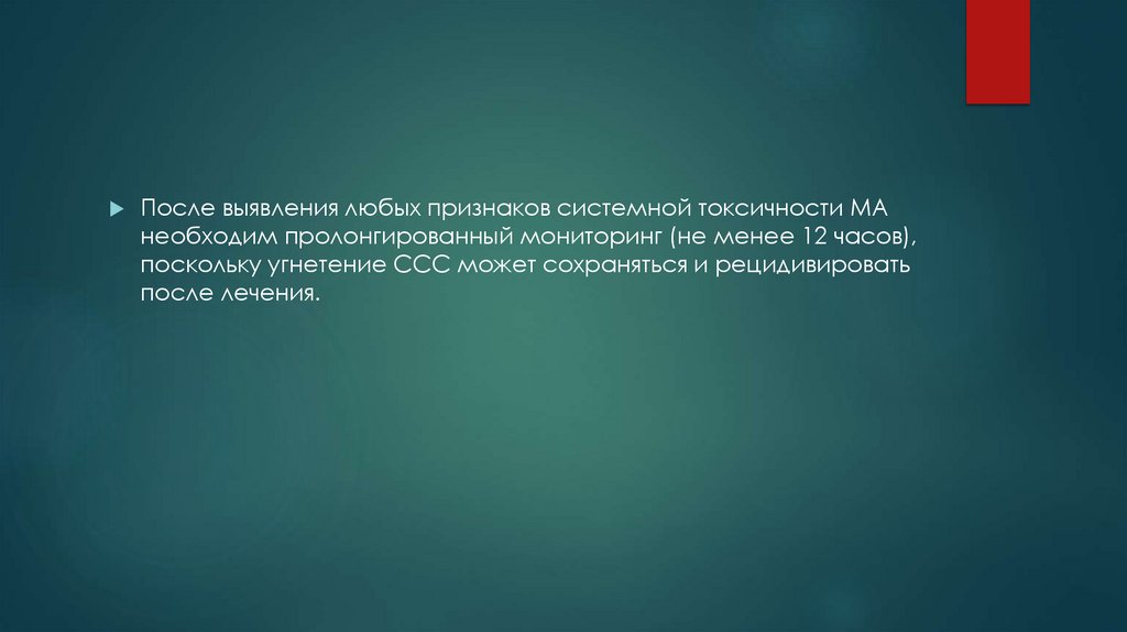 После выявления любых признаков системной токсичности МАнеобходим пролонгированный мониторинг (не менее 12 часов),