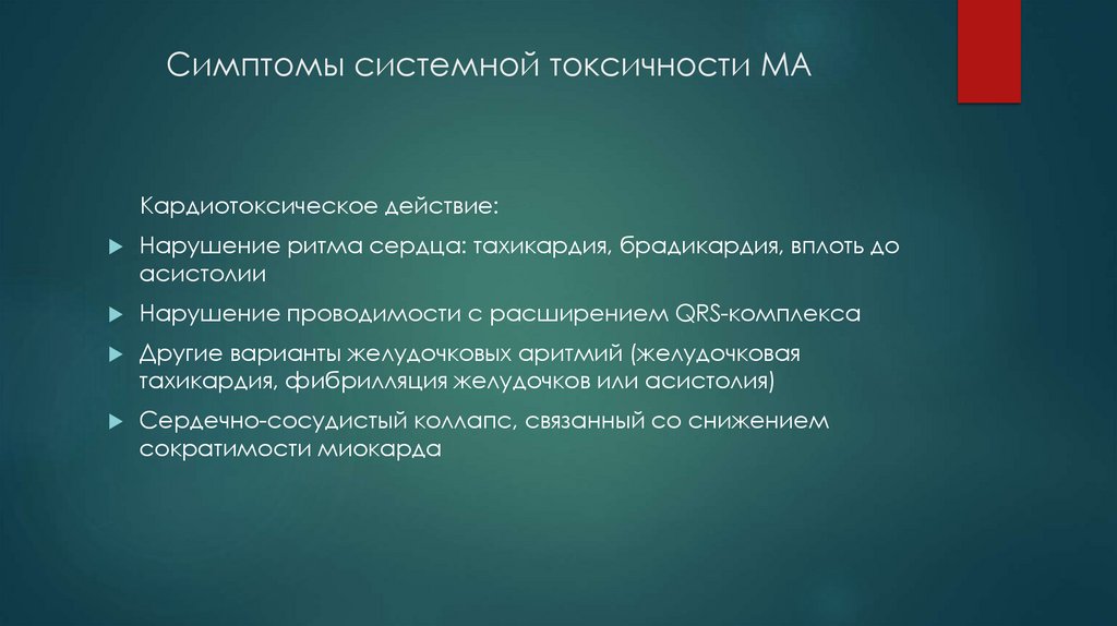 Симптомы системной токсичности МАКардиотоксическое действие: