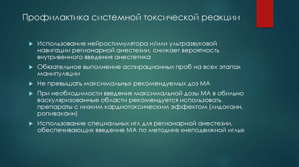 Профилактика системной токсической реакцииИспользование нейростимулятора и/или ультразвуковой