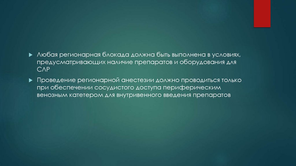 Любая регионарная блокада должна быть выполнена в условиях,предусматривающих наличие препаратов и оборудования для