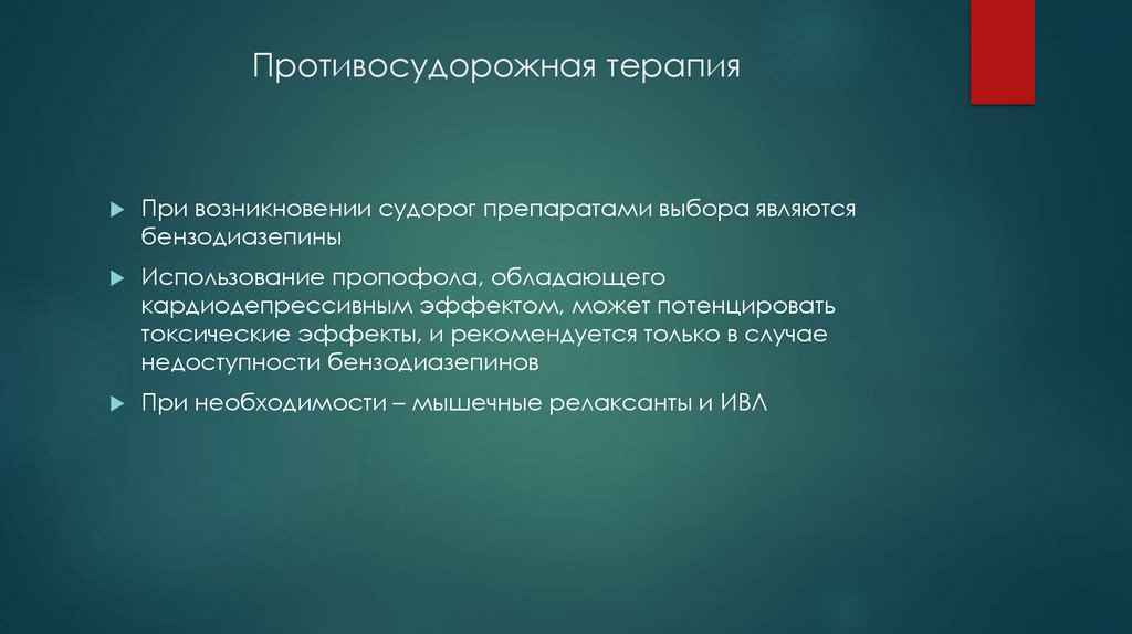 Противосудорожная терапияПри возникновении судорог препаратами выбора являются