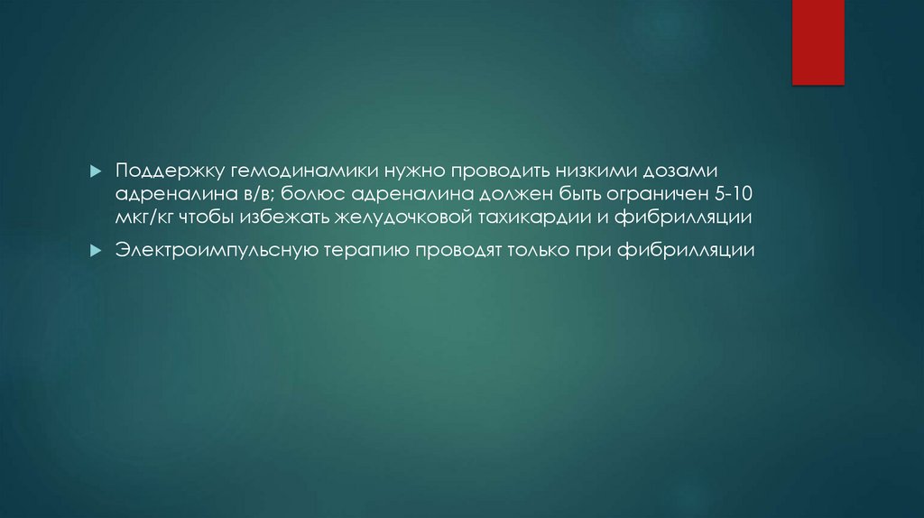 Поддержку гемодинамики нужно проводить низкими дозамиадреналина в/в; болюс адреналина должен быть ограничен 5-10