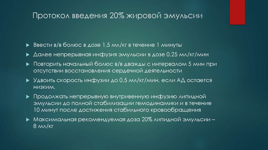 Протокол введения 20% жировой эмульсииВвести в/в болюс в дозе 1,5 мл/кг в течение 1 минуты