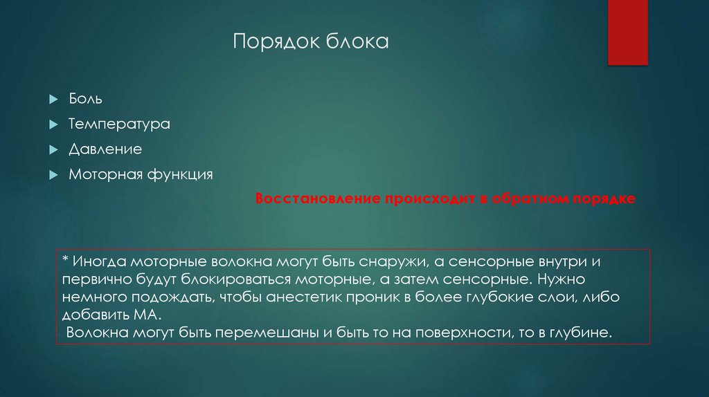 первично будут блокироваться моторные, а затем сенсорные. Нужно