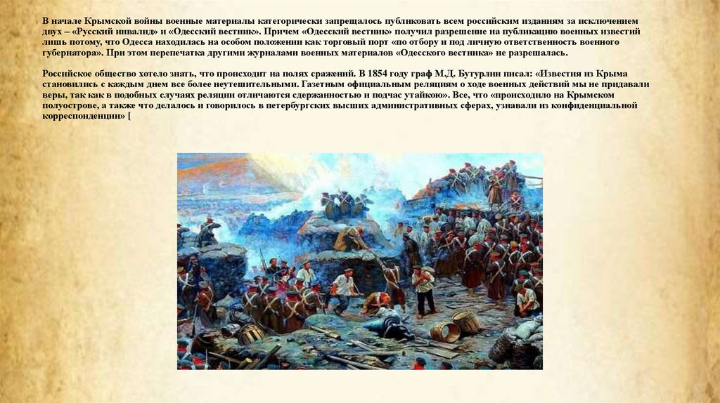 В начале Крымской войны военные материалы категорически запрещалось публиковать всем российским изданиям за исключениемдвух – «Русский инвалид» и «Одесский вестник». Причем «Одесский вестник» получил разрешение на публикацию военных известий