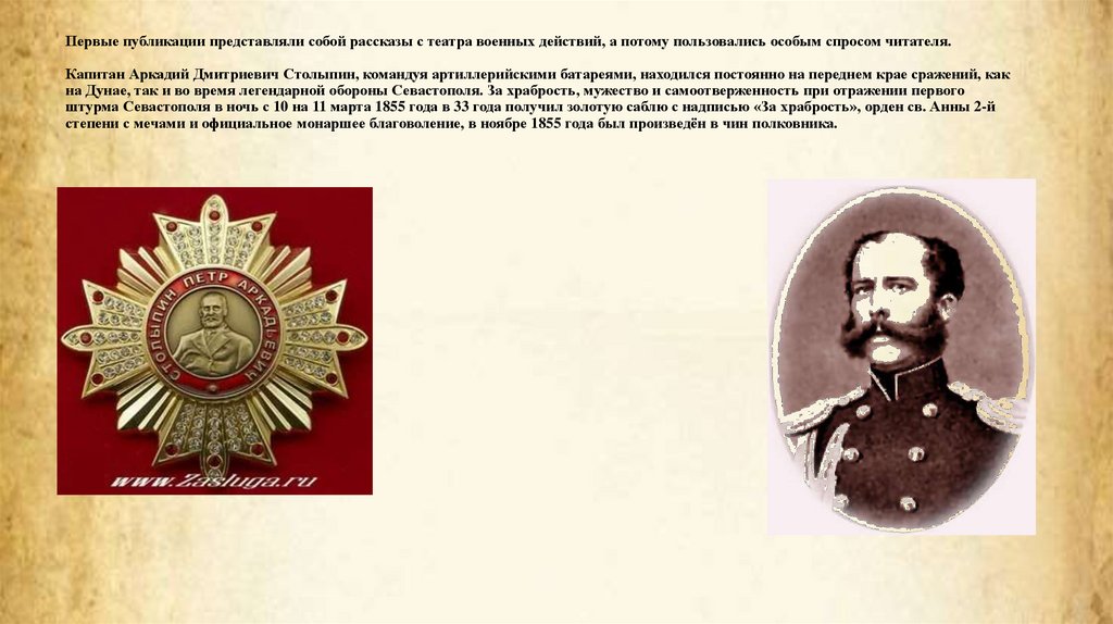 Первые публикации представляли собой рассказы с театра военных действий, а потому пользовались особым спросом читателя.Капитан Аркадий Дмитриевич Столыпин, командуя артиллерийскими батареями, находился постоянно на переднем крае сражений, как