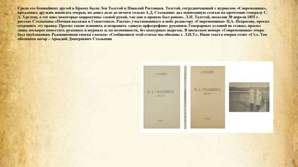 рассказ Столыпина «Ночная вылазка в Севастополе. Рассказ участвовавшего в ней» редактору «Современника» Н.А. Некрасову, просил