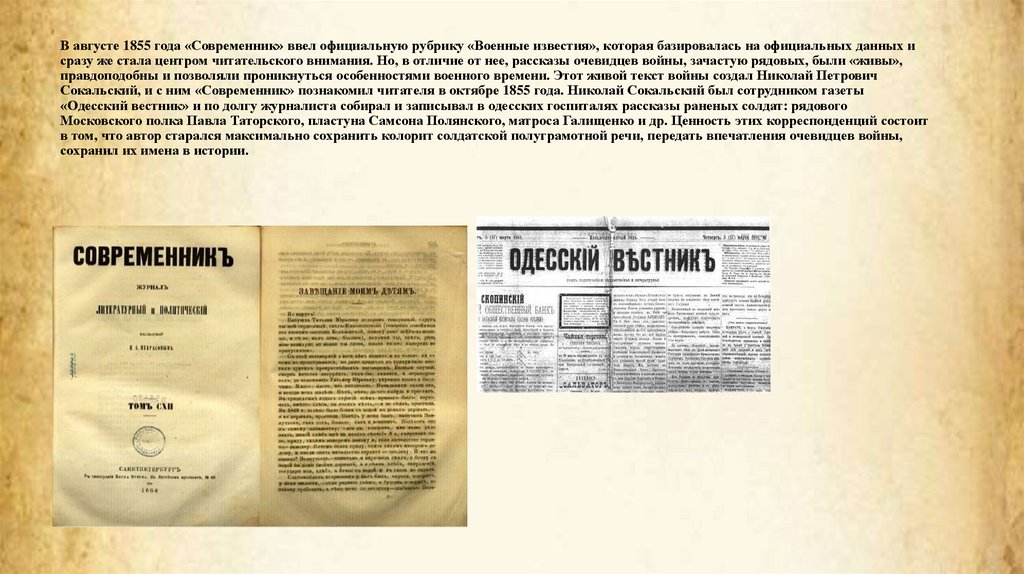 В августе 1855 года «Современник» ввел официальную рубрику «Военные известия», которая базировалась на официальных данных исразу же стала центром читательского внимания. Но, в отличие от нее, рассказы очевидцев войны, зачастую рядовых, были «живы»,
