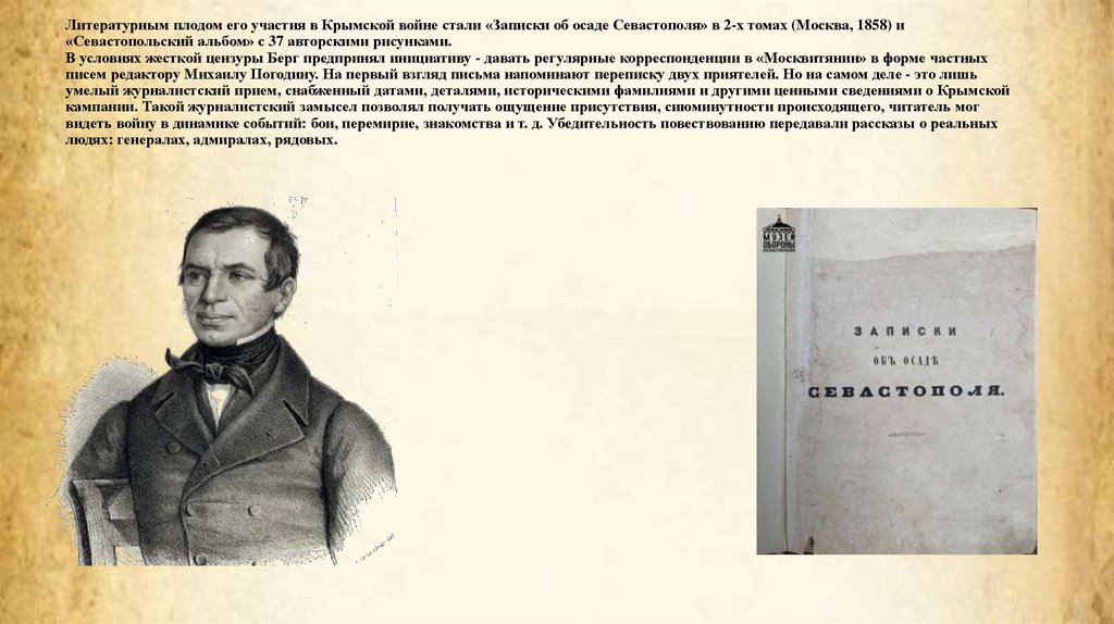 В условиях жесткой цензуры Берг предпринял инициативу - давать регулярные корреспонденции в «Москвитянин» в форме частных