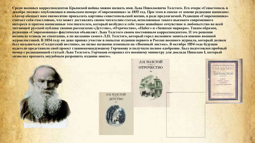 Среди военных корреспондентов Крымской войны можно назвать имя Льва Николаевича Толстого. Его очерк «Севастополь вдекабре месяце» опубликован в июньском номере «Современника» за 1855 год. При этом в сноске от имени редакции написано: