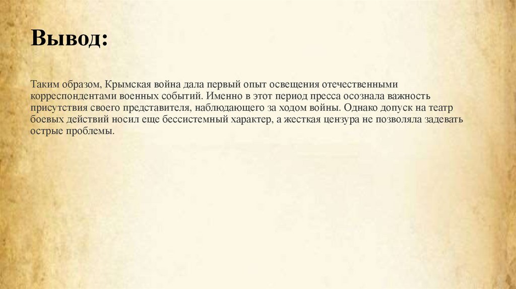 Вывод:Таким образом, Крымская война дала первый опыт освещения отечественными