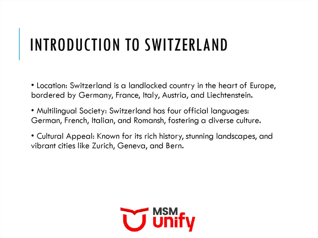 INTRODUCTION TO SWITZERLAND• Location: Switzerland is a landlocked country in the heart of Europe,