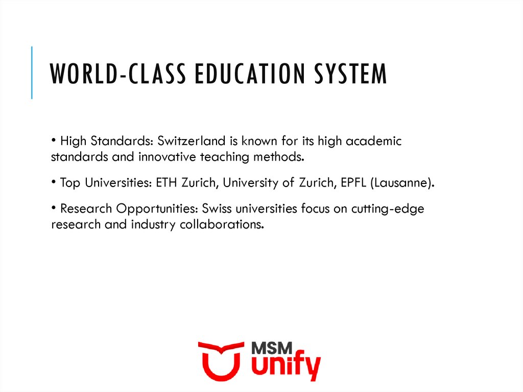 WORLD-CLASS EDUCATION SYSTEM• High Standards: Switzerland is known for its high academic