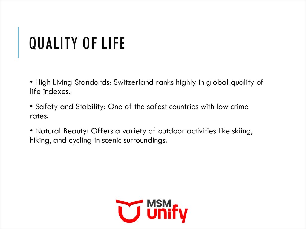 QUALITY OF LIFE• High Living Standards: Switzerland ranks highly in global quality of