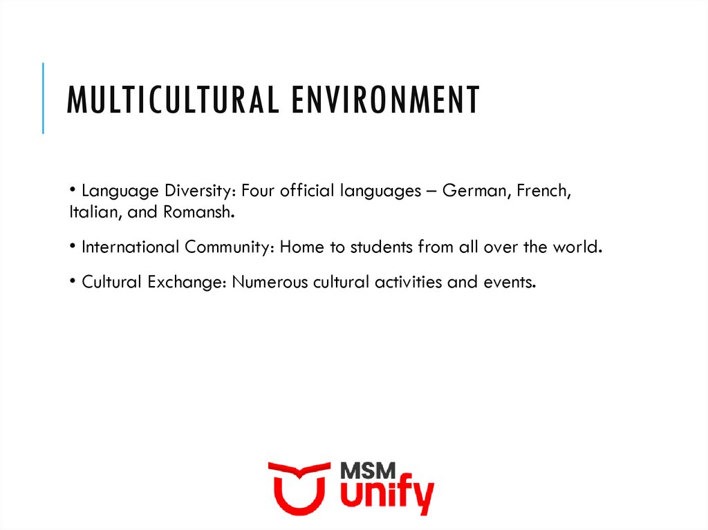 MULTICULTURAL ENVIRONMENT• Language Diversity: Four official languages – German, French,