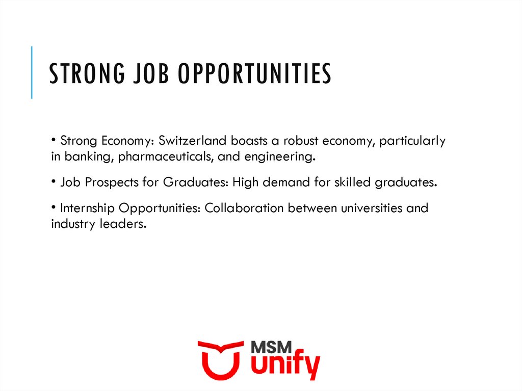 STRONG JOB OPPORTUNITIES• Strong Economy: Switzerland boasts a robust economy, particularly