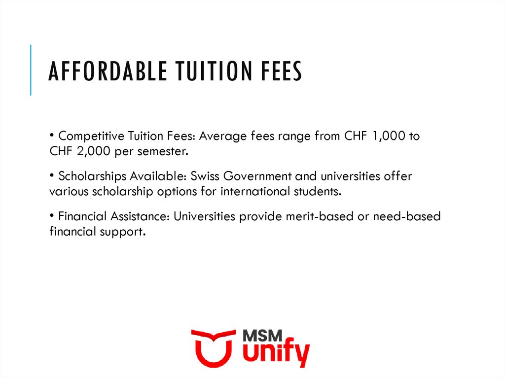 AFFORDABLE TUITION FEES• Competitive Tuition Fees: Average fees range from CHF 1,000 to