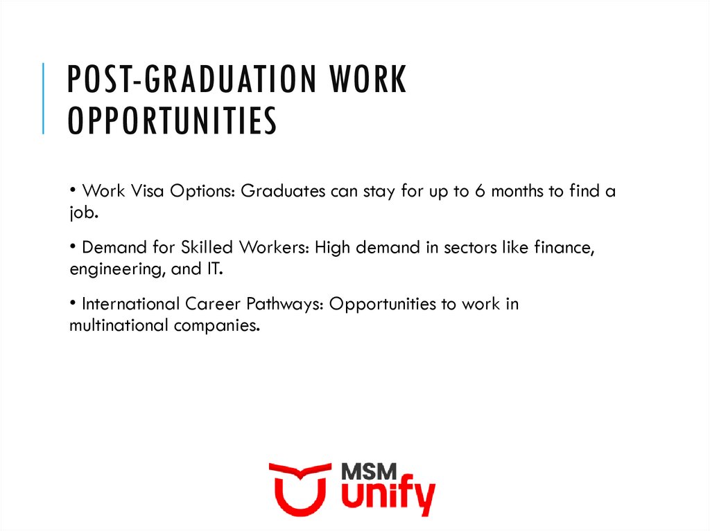 • Work Visa Options: Graduates can stay for up to 6 months to find a