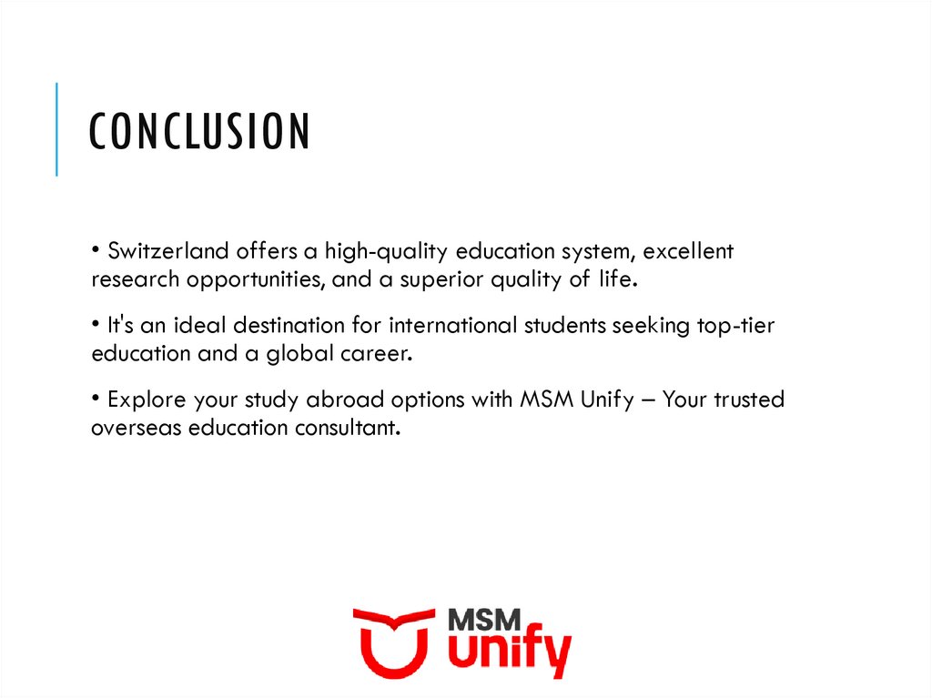 CONCLUSION• Switzerland offers a high-quality education system, excellent