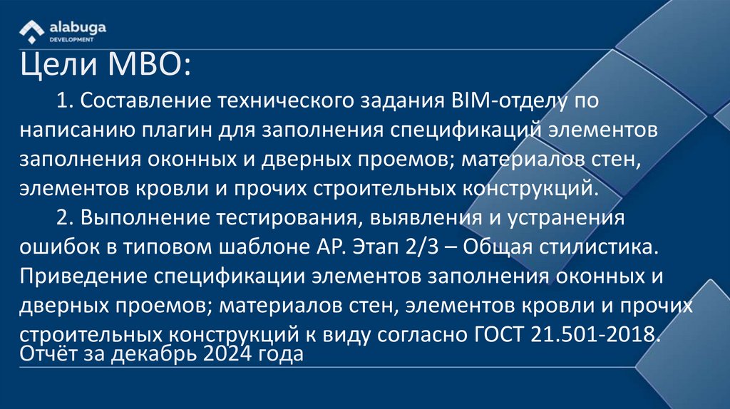 Цели МВО:1. Составление технического задания BIM-отделу по