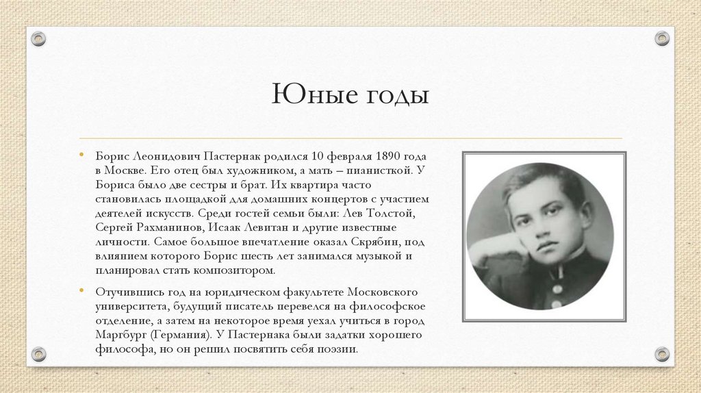 Юные годы• Борис Леонидович Пастернак родился 10 февраля 1890 года
