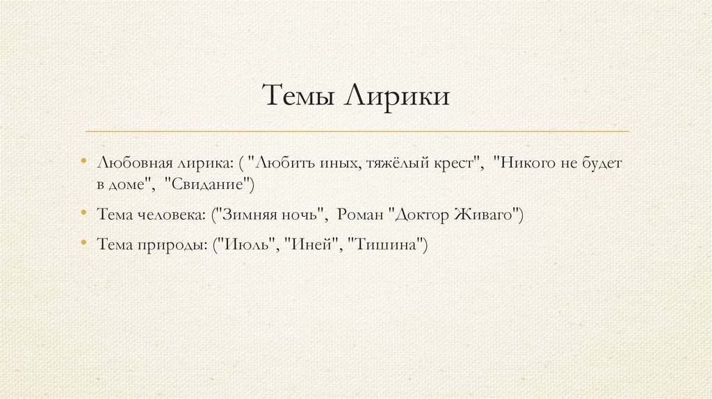 Темы Лирики• Любовная лирика: ( "Любить иных, тяжёлый крест", "Никого не будет