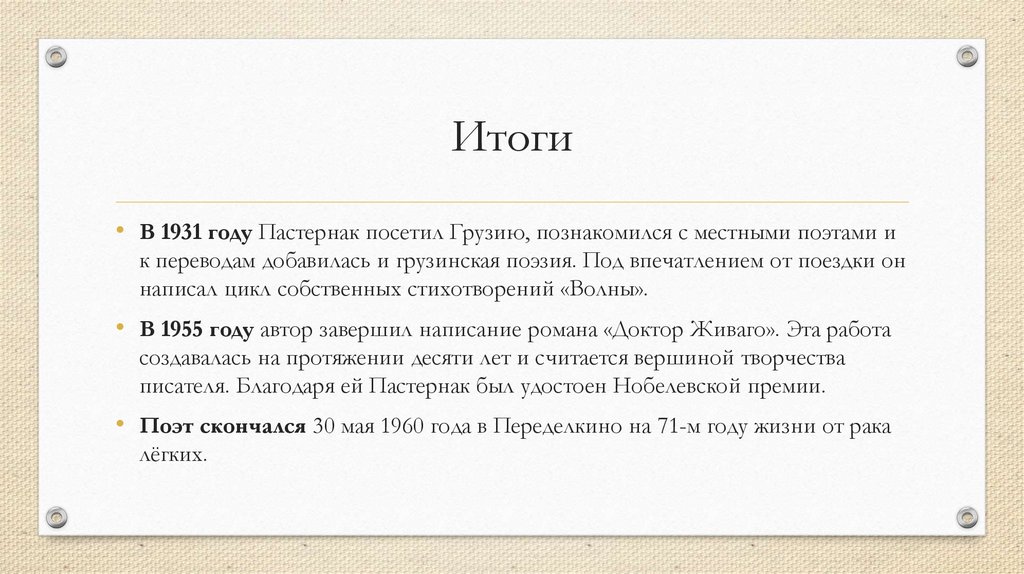 Итоги• В 1931 году Пастернак посетил Грузию, познакомился с местными поэтами и