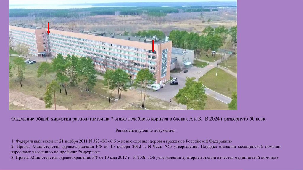 Отделение общей хирургии располагается на 7 этаже лечебного корпуса в блоках А и Б. В 2024 г развернуто 50 коек.Регламентирующие документы:
