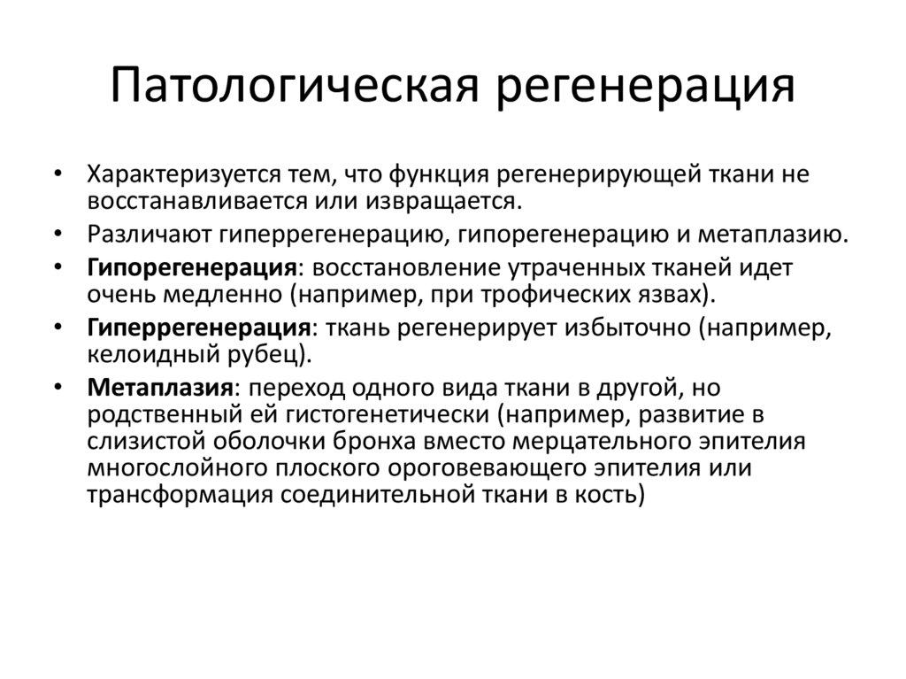 • Различают гиперрегенерацию, гипорегенерацию и метаплазию.