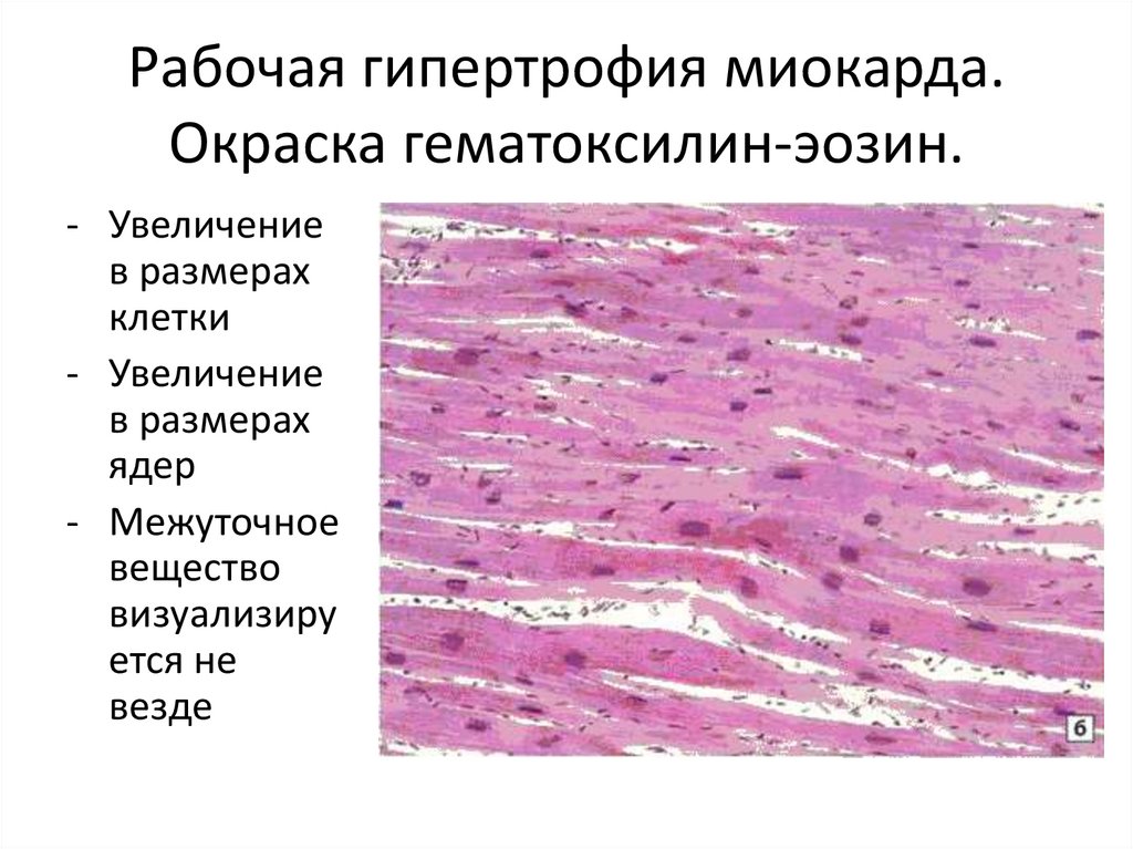 Рабочая гипертрофия миокарда.Окраска гематоксилин-эозин.