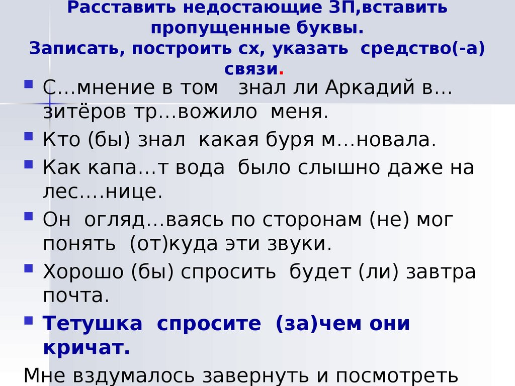 Расставить недостающие ЗП,вставитьпропущенные буквы.