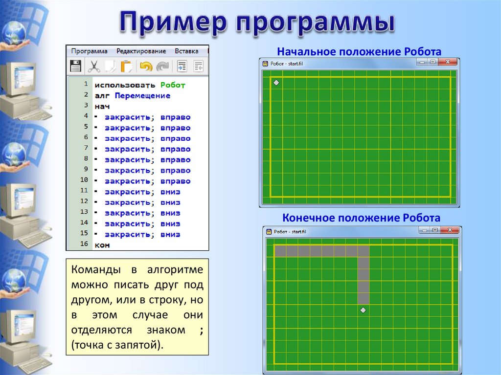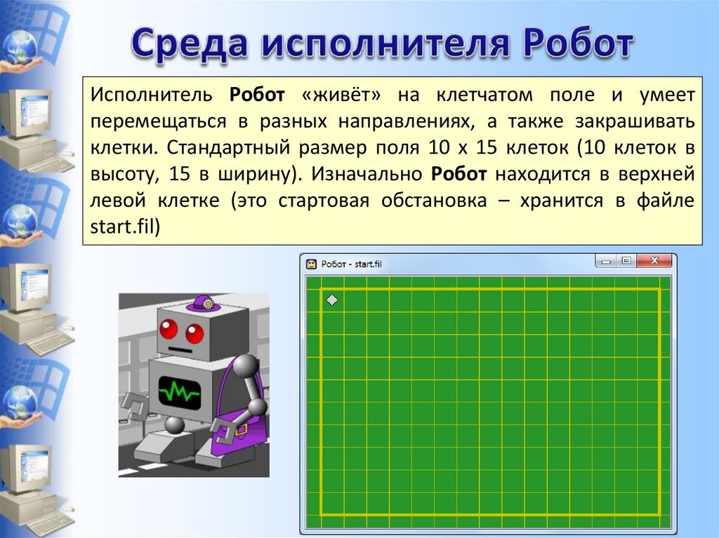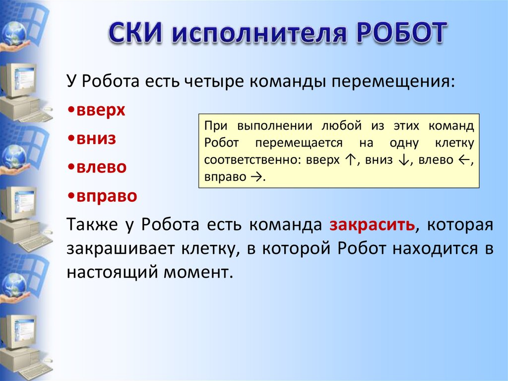 Исполнитель Робот «живёт» на клетчатом поле и умеетперемещаться в разных направлениях, а также закрашивать