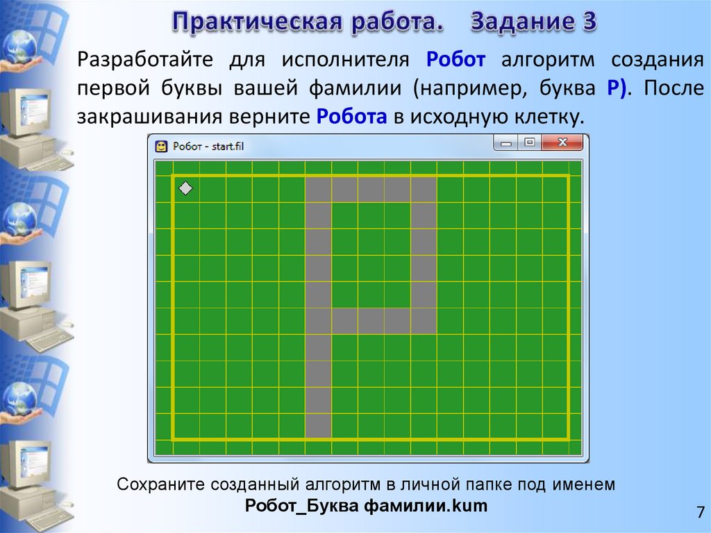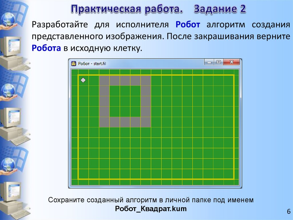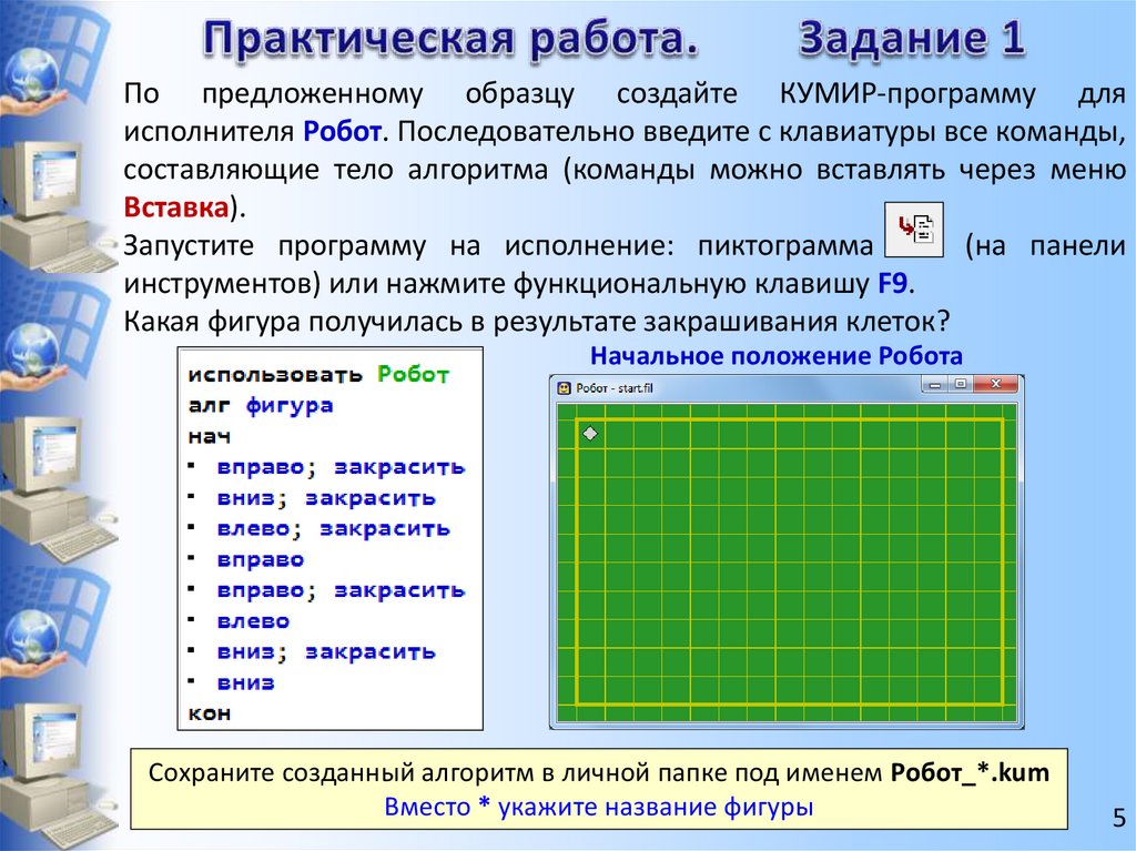 Сохраните созданный алгоритм в личной папке под именем Робот_*.kum