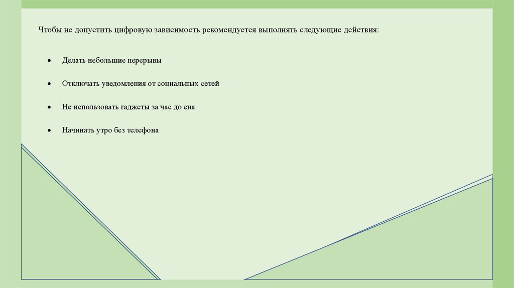 Чтобы не допустить цифровую зависимость рекомендуется выполнять следующие действия:Делать небольшие перерывы