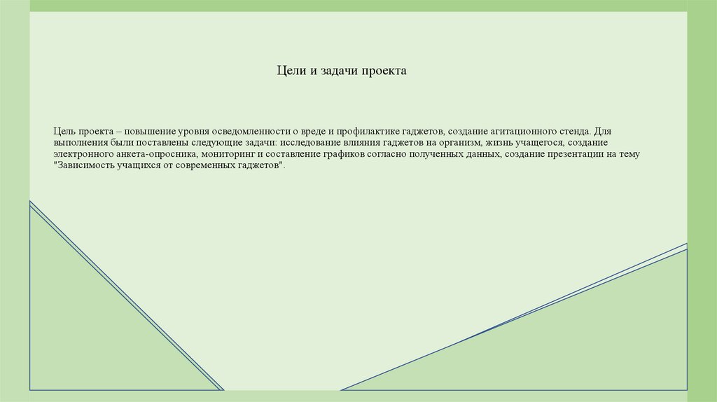 Цели и задачи проектаЦель проекта – повышение уровня осведомленности о вреде и профилактике гаджетов, создание агитационного стенда. Для
