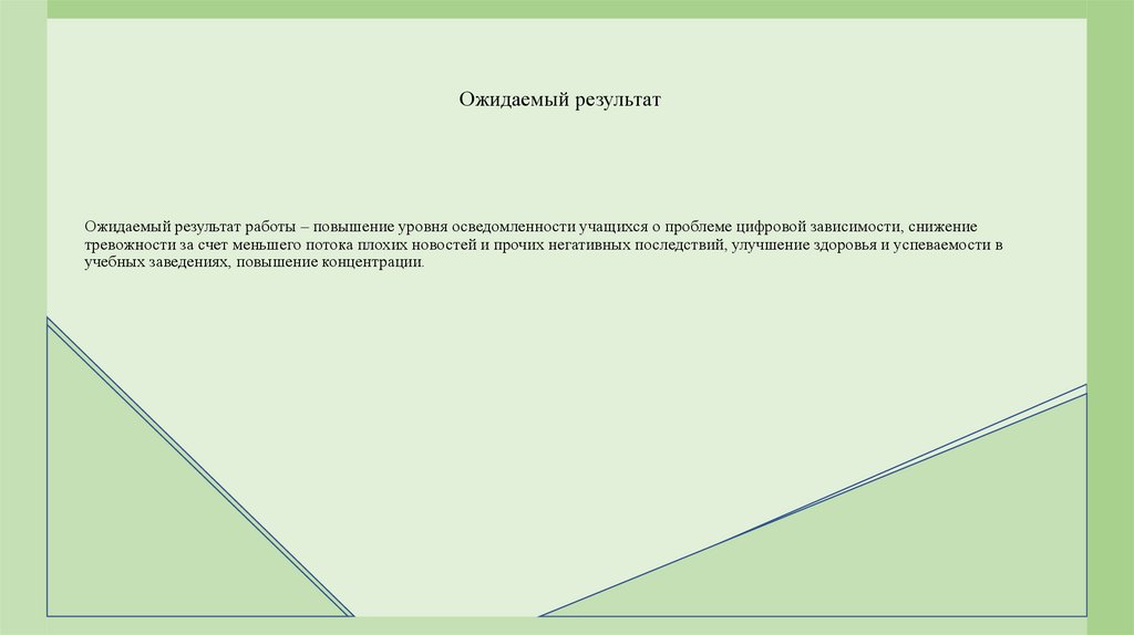 Ожидаемый результатОжидаемый результат работы – повышение уровня осведомленности учащихся о проблеме цифровой зависимости, снижение