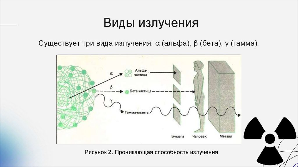 Виды излученияСуществует три вида излучения: α (альфа), β (бета), γ (гамма).